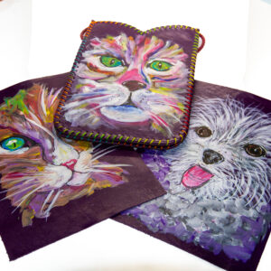 Didar Art’ın “deride sanat” yaklaşımıyla tasarlanan bu kılıf, hakiki deri üzerine tamamen el yapımı akrilik boya ile resmedilmiş canlı kedi portresiyle öne çıkar. Kenarları renkli mumlu iplerle elde dikilmiş, ince el işçiliği detaylarıyla kaliteyi hissettirir. Telefon, kart ve küçük aksesuarlar için konforlu bir taşıma çözümü sunar.