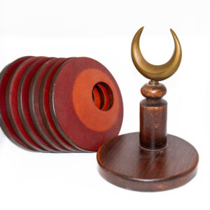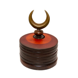 Altlıklar kullanılmadığında stant üzerindeki milde üst üste dizilerek masa üzerinde heykelsi bir form oluşturur. Pirinç alaşımlı hilal başlık, Osmanlı‑Selçuklu estetiğine vurgu yaparken aynı zamanda kolay tutuş sağlar; dileğinize göre çıkartılıp sade şekilde de kullanılabilir.