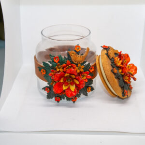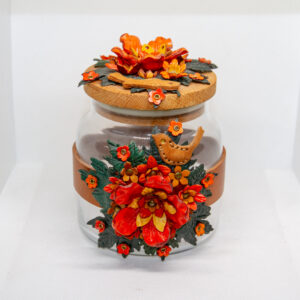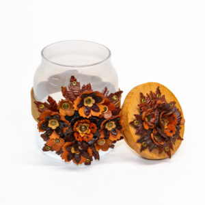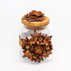 Didar Art atölyesinde “deride çiçek açan tasarım” anlayışıyla hazırlanan bu orta boy kavanoz, mutfaktan çalışma masasına dek dekoratif işlevselliği bir araya getirir. Şeffaf, kalın cidarlı cam gövde, doğal meşe kapak ve çevresini saran yumuşak deri bantla dengeli bir malzeme kontrastı sunar. Kapak ve gövde üzerine tek tek elde kesilen, ısıyla şekillendirilip balmumu ile renklendirilen deri çiçekler; pirinç kuşgözü detaylarıyla sabitlenir, böylece hem dayanıklılık hem de zarif bir 3D efekt elde edilir. İç yüzdeki ince silikon conta, şeker‑baharat, kahve çekirdeği ya da atölye boncuklarını taze tutmayı sağlar; dekoratif objeler için tozsuz sergileme imkânı verir. Yılda bir kez doğal yağ/sirke karışımı ile meşe kapak bakımı, deri kısımlarda ise renksiz balmumu uygulaması yeterlidir.