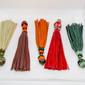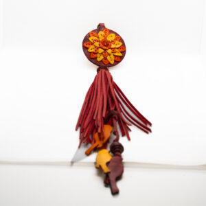 Didar Art atölyesinde “sıfır atık deri” yaklaşımıyla üretilen bu püskül, çanta ve cüzdan üretiminden arta kalan küçük deri parçalarının yeniden hayat bulduğu özgün bir aksesuardır. Bitkisel tabaklanmış dana/oğlak derisi, ustalar tarafından milimetrik hassasiyetle şerit hâlinde kesilir; balmumlu iplikle düğümlenerek hafif, sessiz ve uzun ömürlü bir form kazanır. Başlık kısmındaki seramik boncuklar ile katmanlı deri çiçek rozetleri, Ege’nin gelincik kırmızısı, zeytin yeşili ve bakır tonları gibi canlı paletlerle elde boyanır. Doğal esnekliği sayesinde kırışmaz, renkli yüzeyi yıllar içinde parlaklığını korur; yılda bir renksiz deri balmumu bakımı yeterlidir.